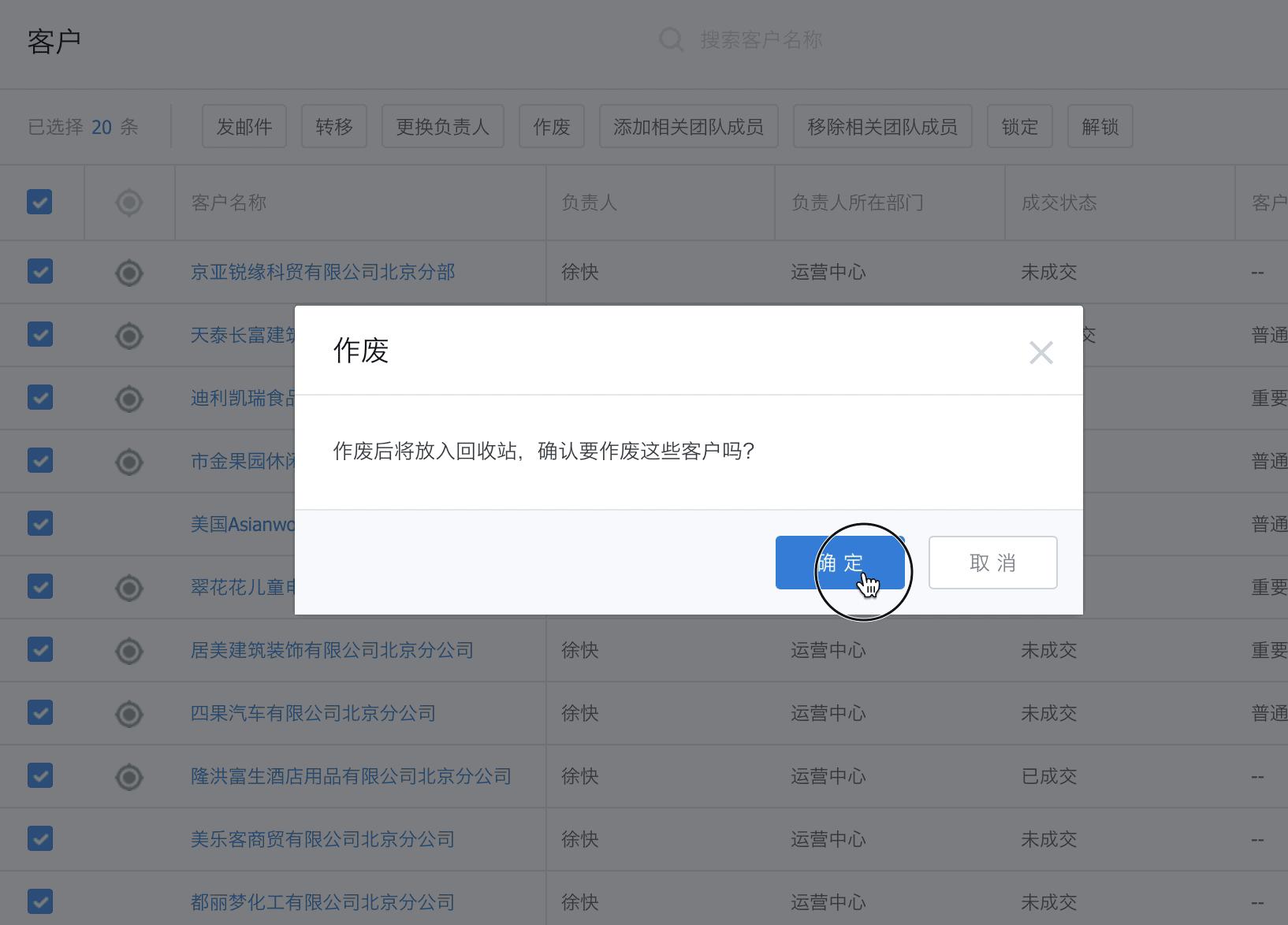 后台也可以用自定义勾选的方式对多个列表内容进行批量操作,如图可勾需多个列表或全选后进行批量删除、作废、更改负责人、发邮件、发信息、转移等等…