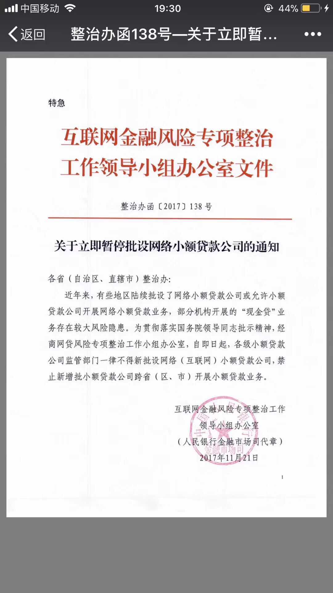 据凤凰网WEMONEY消息,11月21日,有消息称,互联网金融风险专项整治工作领导小组办公室下发《关于立即暂停批设网络小额贷款公司的通知》。知情人士告诉凤凰网WEMONEY,该消息属实。根据《通知》,自即日起,各级小额贷款公司监管部门一律不得新批设网络(互联网)小贷公司,禁止新增批小贷公司跨省(区、市)开展小额贷款业务。《通知》指出,近年来有些地区陆续批设了网络小贷公司或允许小贷公司开展网络小贷业务,部分机构开展的“现金贷”业务存在较大风险隐患。