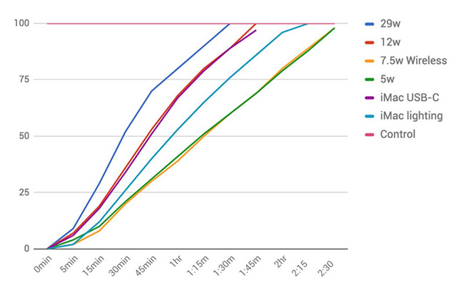 如果选购 149 元的 12W 的充电器,虽然输入功率上不如 29W,但已经比 5W 的慢充头快得多了。根据 AppleInsider 的测试,给 iPhone 8 Plus 充满电,12W 充电器虽然比 29W 的慢了约 20 分钟,却足足比 5W 慢充头快了一个小时。