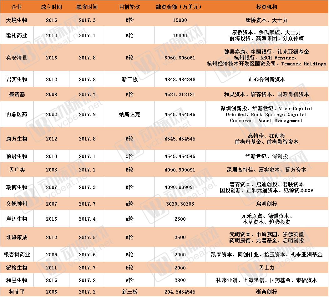 2017年的投融数据目前只截止到了9月份,但在再鼎医药(现以纳斯达克上市)、药明康德、亚盛医药、基石药业等领先企业纷纷在上年已完成大额融资的情况下,还能这样额度的融资,可见资本今年对医药创新的投资热情并未减少。