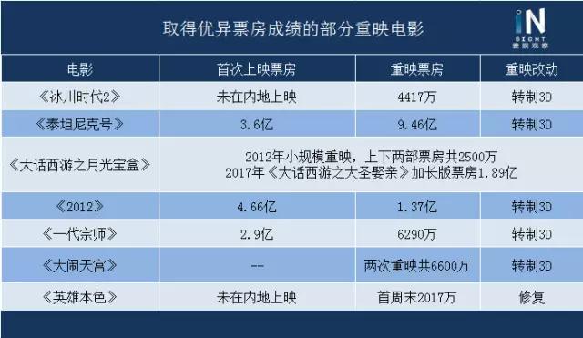 这两年来,不少重映电影都取得了不错的票房成绩,今年上半年由影联传媒发行的重映影片《大话西游之大圣娶亲》就取得了1.89亿的华语电影重映最高票房,再往前的3D版《泰坦尼克号》,2012年重映时在中国取得了将近10亿的票房。