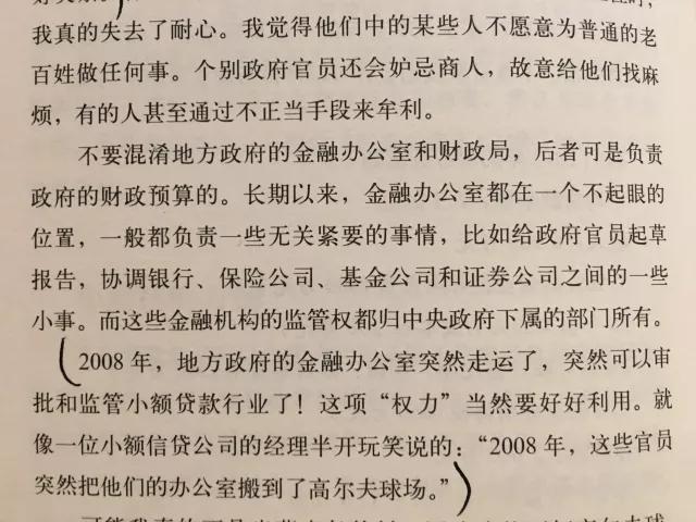 “与我的失败形成对比,中兴微贷和证大速贷(都是深圳的公司)的朋友们都成功地说服了中国银行和中国建设银行,让他们做银行的小额贷款中介,本质上就是可以利用银行的钱来放贷。”