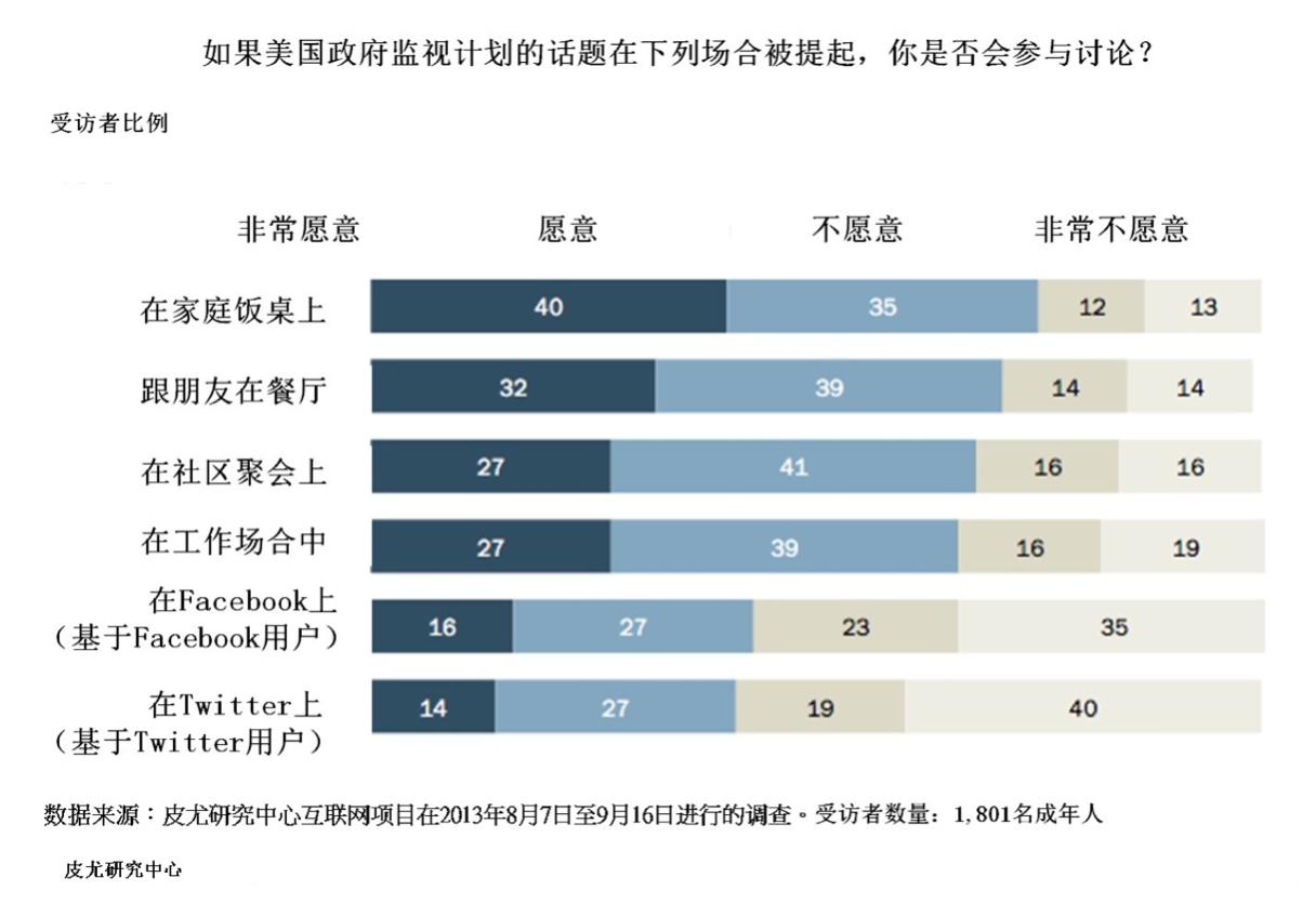 「过滤泡泡」里的世界人们变得越来越同质化也得到了数据的证实。最近皮尤研究中心发表了一份[针对社交媒体的研究报告]( http://www.pewinternet.org/2014/08/26/social-media-and-the-spiral-of-silence/ ),报告称,社交媒体降低了人们表达意见的可能性,尤其是当他们认为自己的看法与朋友不同的时候。人们在社交媒体上讨论不同观点的情况甚至比线下世界还要低。比如愿意在家庭饭桌上讨论敏感问题的占 40%,而在被公认为重大事件讨论和传播的社交媒体 Twitter 上比例却最低,只有 14%,非常不愿意的比例达到了 40%。人们忌讳在与自己相似的人群中发生观点冲突。