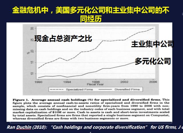 关于企业能够安然度过次贷危机的原因,也许不同行业的人会有不同的解释角度。但是这张图反映的就是,集中主业的公司往往比多元化经营的公司,拥有更高的现金比重。而大家都知道金融危机发生的时候,银行和其他的金融机构都不愿意放贷,大家都把手里的现金捂得更紧。