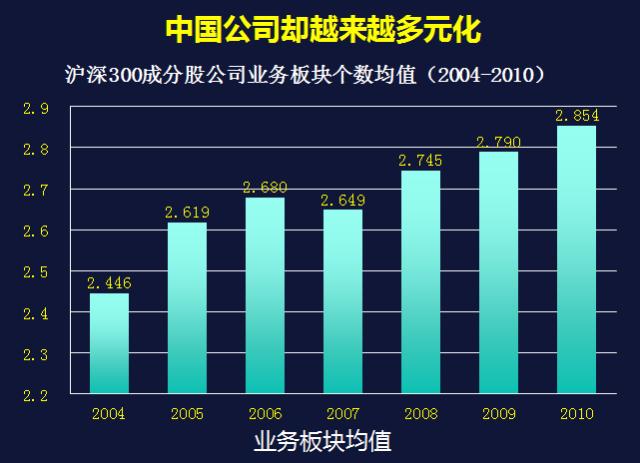 反观我们国内的公司,国内主要上市公司的业务板块明显在一直持续扩张:从2004年到2010年,沪深300公司业务板块的数量从2.44上涨到2.85。