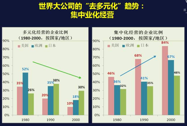 根据麻省大学教授Lawrence Franco对美国、欧洲、日本 “去多元化趋势”做过的一个统计结果来看,在1980年至2000年期间,三个国家或地区前200名的大公司中,多元化经营公司的比例逐年递减(左图)、集中主业公司的比例逐年递增(右图)。欧洲和日本的去多元化趋势,基本上比美国要慢上十年左右。