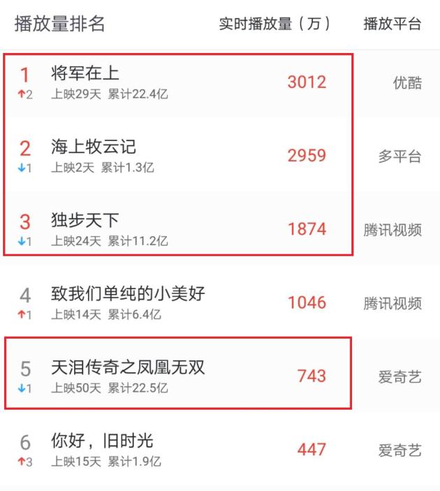 目前视频网站平台上播出的网剧中,实时播放排名前五中有4部为古装剧(图/猫眼专业版)