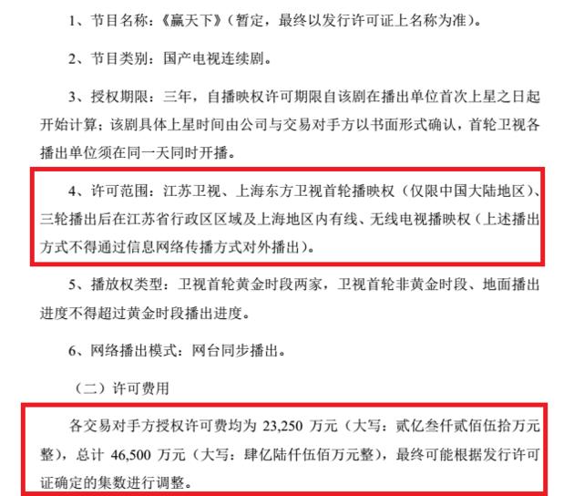 11月21日,唐德影视发布公告,根据协议内容,《赢天下》将在2018年江苏卫视和东方卫视黄金档拼播首轮播出。而网络平台的播出,此前唐德影视已与天猫技术签订了网络独播权协议。随着此次卫视档的最终确定,网台播出模式也确定为“网台同步播出”。