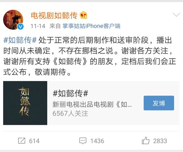 对于“延期”的说法,《如懿传》官微曾回应称,“《如懿传》正处于正常的后期制作和送审阶段,播出时间从未确定,不存在挪档之说。”不过,从目前情况来看,《如懿传》还是未能确定档期,这也是不争的事实。