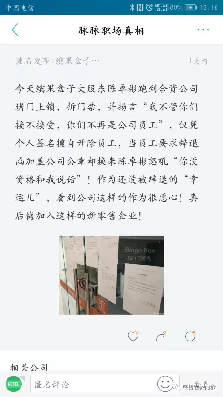 11月21日晚间,职场社交平台脉脉匿名区,爆出两通涉及缤果盒子的消息。认证为“缤果盒子员工”的爆料人称,21日当天,缤果盒子大股东陈卓彬,将缤果盒子参股公司——佛山倍便利商贸有限公司(以下简称“倍便利”)大门上锁,门禁拆除,并张贴多张员工违纪开除通知书,宣布立即解除与相应员工的劳动合同。