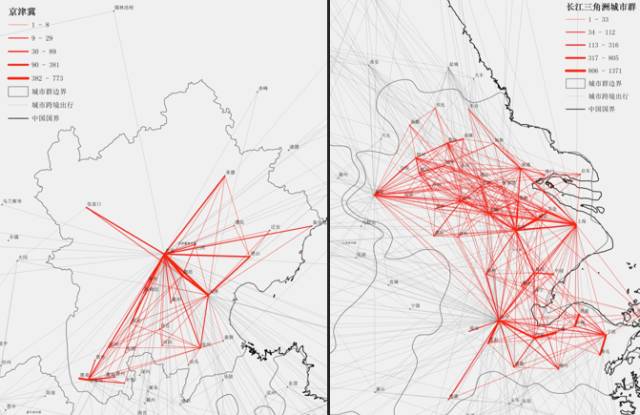 京津冀与长三角城市群跨城出行示意图。