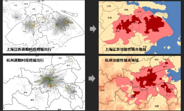 通过通勤时段跨城出行数据分析,可以很明显看出江苏、上海和昆山间交通往来十分密切,江苏和常熟、太仓,昆山及上海也有较密切的出行联系,构成了江苏/上海大都市区。而以杭州为例,与杭州有密切出行往来的城市有绍兴、富阳和海宁以及临安和桐乡的部分乡镇街道办事处。