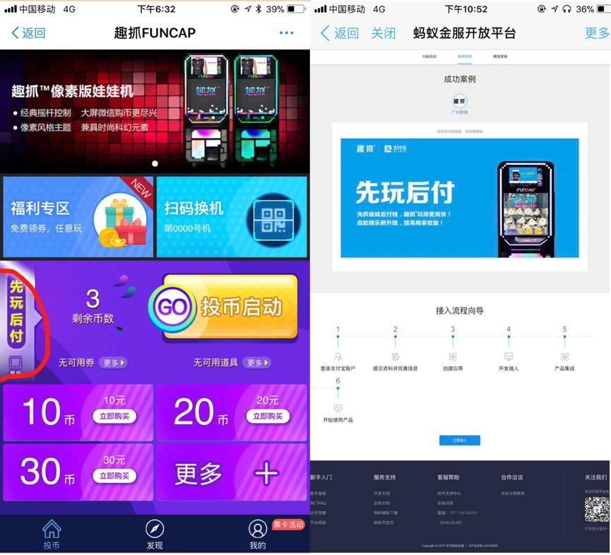 先玩后付:娃娃机是一个高频投币的消费行为,传统的游艺设备多以游戏币作为结算手段。为缩短消费路径,数娱科技在支付方式上做了多种尝试。在游艺设备服务商中数娱率先拿到ICP增值电信业务牌照,发行线上游戏币。在此基础上,公司于近期上线了“先玩后付”功能,与蚂蚁金服合作,依据支付宝开放的用户征信评级将每位用户先玩后付的消费额度分成50元、100元等几档。用户只需扫描机器上的支付宝入口便可跳转到消费界面,选择先玩后付开始抓娃娃,一天后消费的账单将被寄给用户。