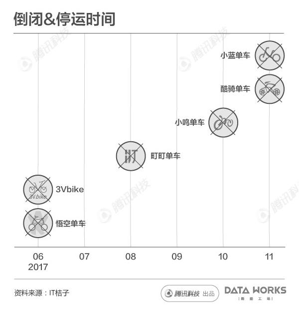近期,处在第二、三梯队的共享单车公司出现倒闭潮,从最早倒闭的悟空单车到最近的小蓝、酷骑单车,短短5个多月的时间就先后有至少6家共享单车企业宣告倒闭&停运。一大批跟风而进的共享单车企业相继倒闭&停运,整个共享单车行业或迎来难熬的寒冬,濒临破局的说法蔓延开来。