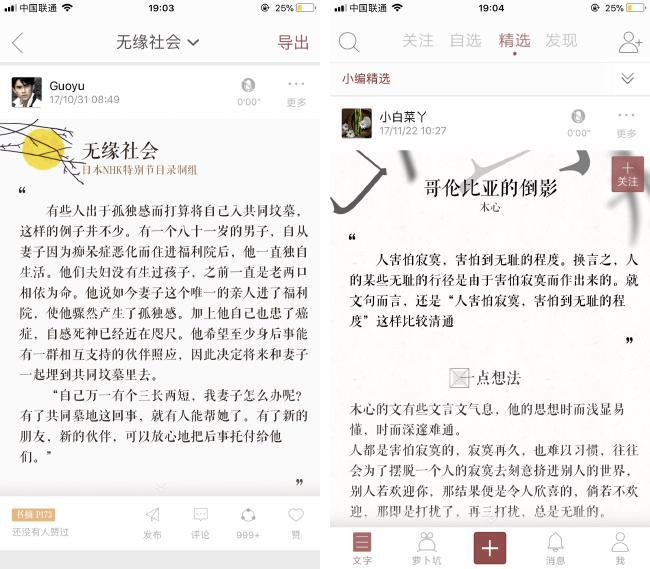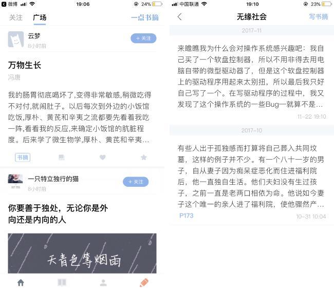 一点书摘也是走「工具+社交」的方向,界面设计也是简洁风。意外的是虽然可以给书摘添上模板,但在社区的列表页是看不到的模板样式的,必须点击进入书摘详情。可能开发者不希望界面太花哨吧,不过笔者觉得既然已有了想让应用变美的意思,就不怕在列表上也表现出来,也许更吸引人,也能将不同读者的分享区别开来。