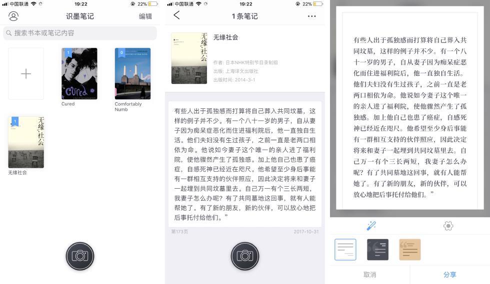识墨则是一款完全没有社交功能的纯工具型书摘记录 App,整个界面几乎只有书架。书摘详情页以及分享页的设计也非常简洁,虽然乍看之下像纯文本,但其实挺养眼。识墨还支持用户在选择识别区域时「多选」,比如当需要识别同一页面的第二和第四段时,不再需要把第三段也一同识别再人手删除;也不需要分开两次识别而浪费次数。