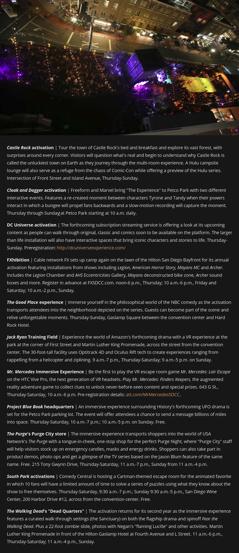 不仅如此,自从今年西南偏南的快闪沉浸式体验《西部世界》大火并一举拿下戛纳国际创意节金雄狮奖之后,品牌商似乎一夜间都开了窍。看一下即将开始的圣地亚哥动漫展(全球影响力第一的动漫展),多如牛毛的品牌快闪活动几乎清一色为沉浸式体验(下图图二为活动列表)。