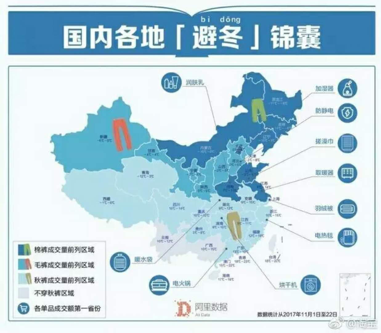 昨天@淘宝 根据阿里大数据发布了一份“避冬”锦囊,统计了今年11月1日到22日国内各地的冬季必备生活用品采购情况。