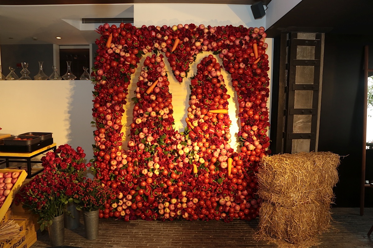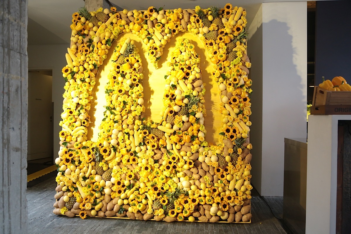 11 月 21 日晚,在上海外滩一栋始建于上世纪 30 年代的老建筑内,是布满了新鲜蔬果的「金拱门」标志。
