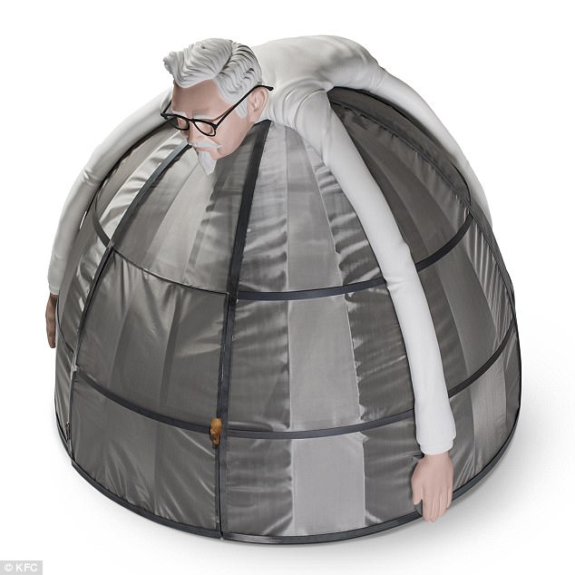 帐篷直径约2.1m,高1.98m,可以容纳3-4个人。外观也是很奇特,被玩坏了的山德士上校又亮相了,“趴”在帐篷顶部,以超长的手臂阻止你拥抱互联网。