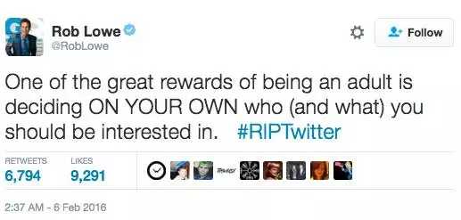 通过算法调整 Twitter 时间线内容的做法让 Rob Lowe 极为不爽