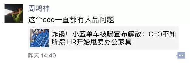 360创始人周鸿祎在朋友圈转发了一篇文章《炸锅!小蓝单车被曝宣布解散:CEO不知所踪HR开始甩卖办公家具》并附上了自己的一句话评语:这个CEO一直都有人品问题。