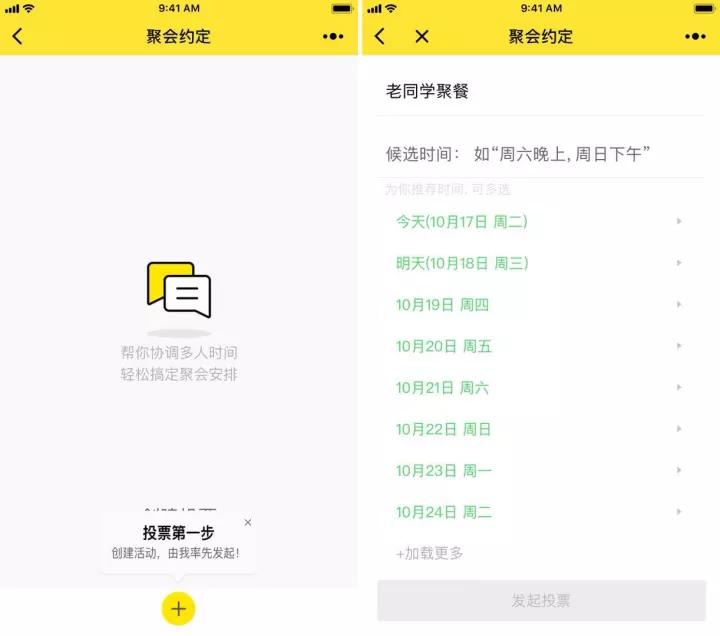 首先通过「聚会约定」小程序主界面的「创建投票」发起聚会投票,并输入聚会的内容与聚会的候选时间。而聚会的候选时间就是由之后要提到的投票选出来的。