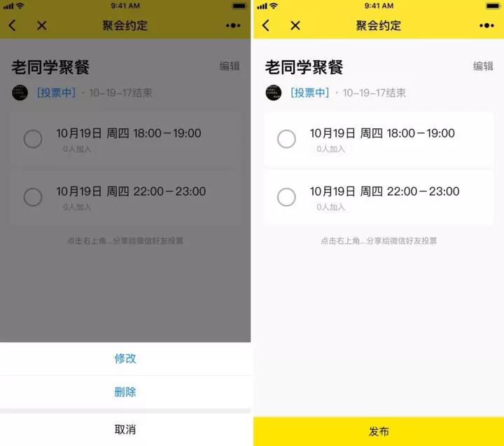 在输入聚会内容与聚会的候选时间后通过「发起投票」按钮生成一个新的聚会约定。