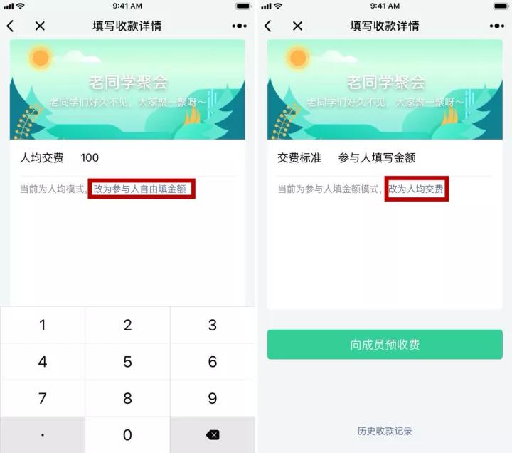 若选择的「人均模式」,则需要填写金额。若选择的是「参与人自由填金额模式」则无需填写金额。在确定好选择的模式和填写的金额后,就可以点击「向成员预收费」了。