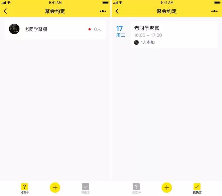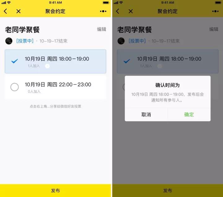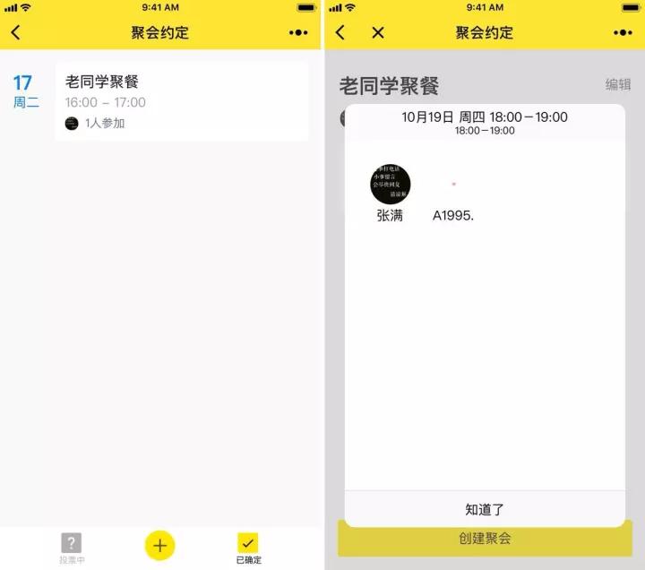 在选择好了时间之后就可以点击「发布」了。发布后,已确定里就会出现你刚刚发布的聚会,并会通知你的每一个参加的好友。