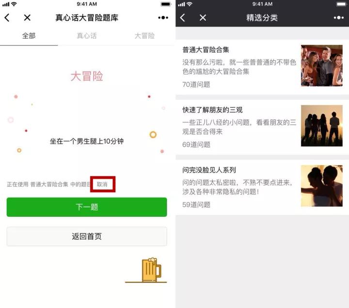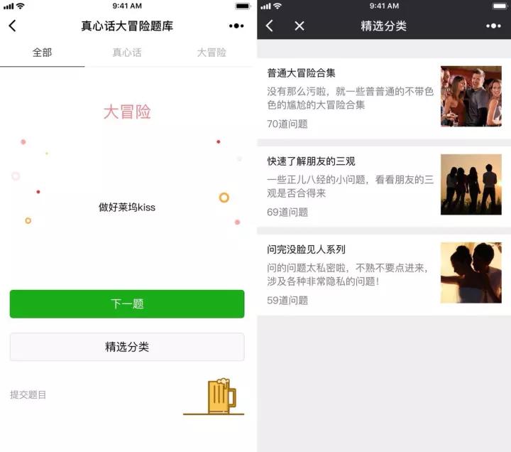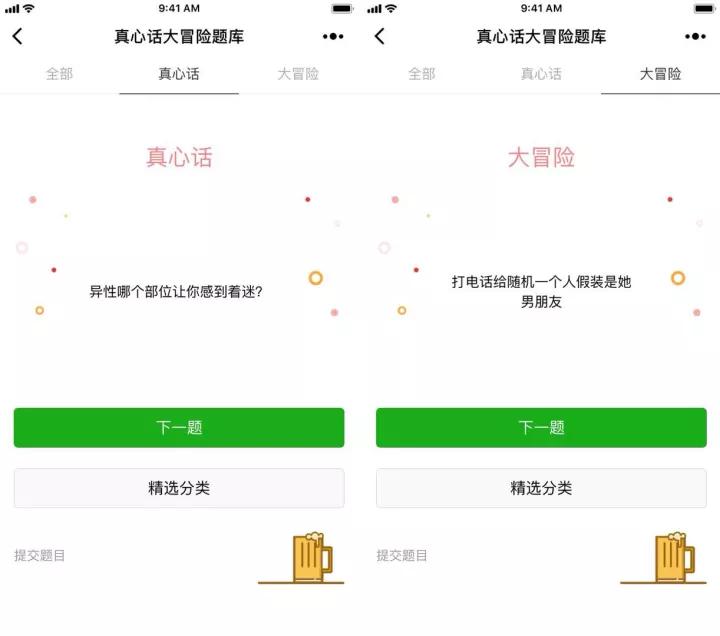 在点击「真心话小程序」小程序之后,直接就是真心话与大冒险的题库合集,不需要上网去找,这里的题都很刺激。当然,你也可以选择想要的题库合集。