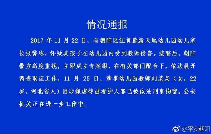 北京警方通报:红黄蓝幼儿园涉事幼儿园教师被刑拘,涉嫌虐待被看护人罪