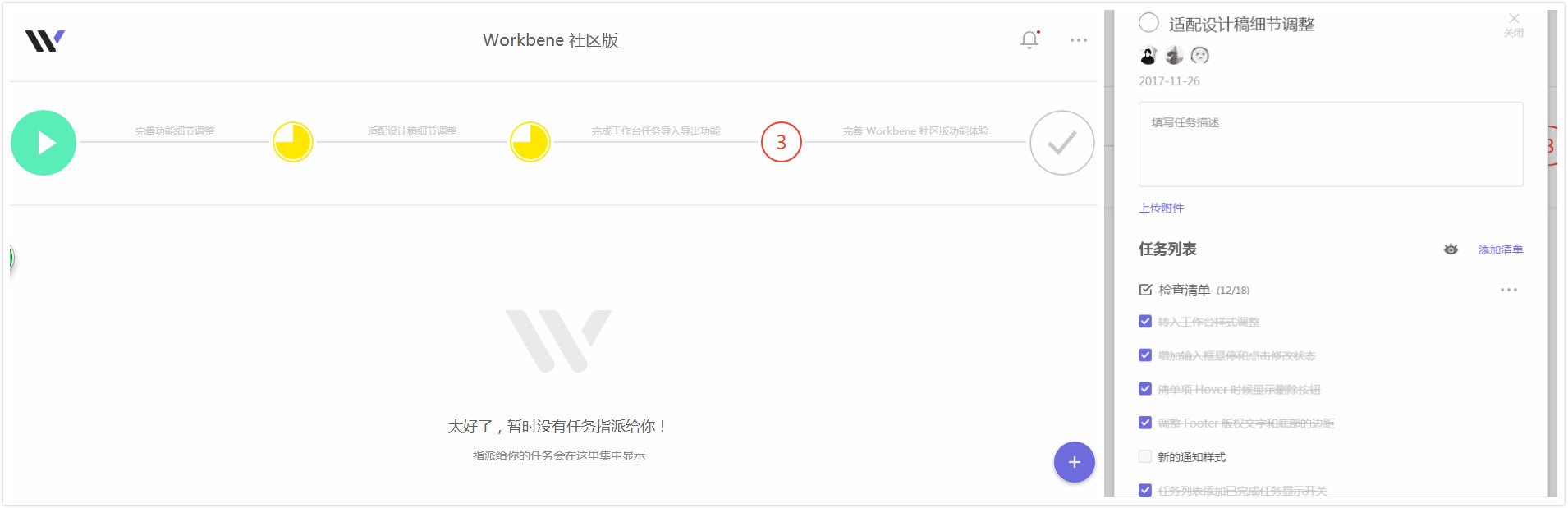 在工作台的中心部位,会显示出所有指派给你的任务。这就避免了用户在使用类似 Worktile 或 Teambition 时,打开后需要多次页面跳转,从一堆列表中找自己任务的尴尬。