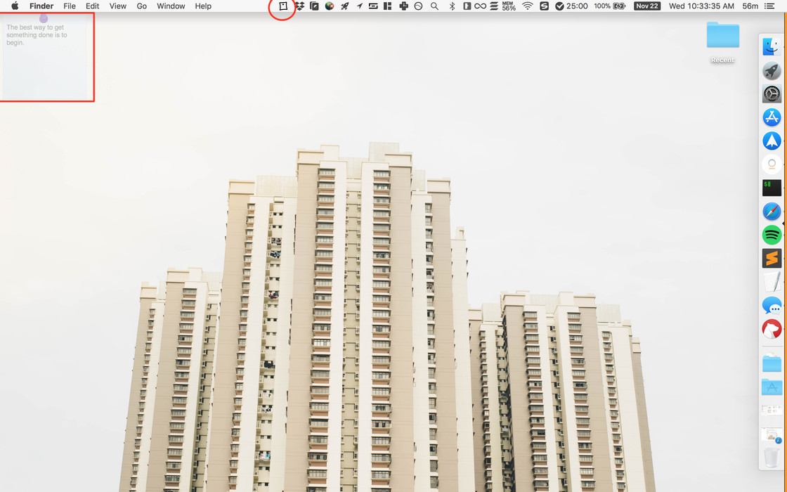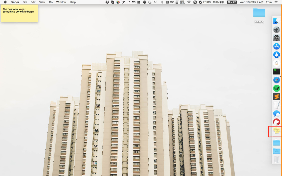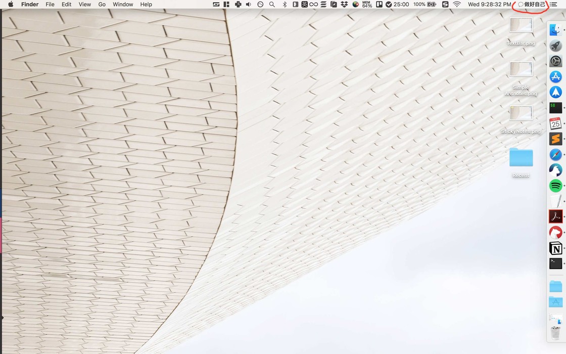 最先想到的是Mac下自带Stickies的APP,因为座右铭的确作为一种便签的存在。但是最不喜欢的就是它不能隐藏dock上的图标,作为一个只是想单纯写座右铭的功能,实在是有点累赘。