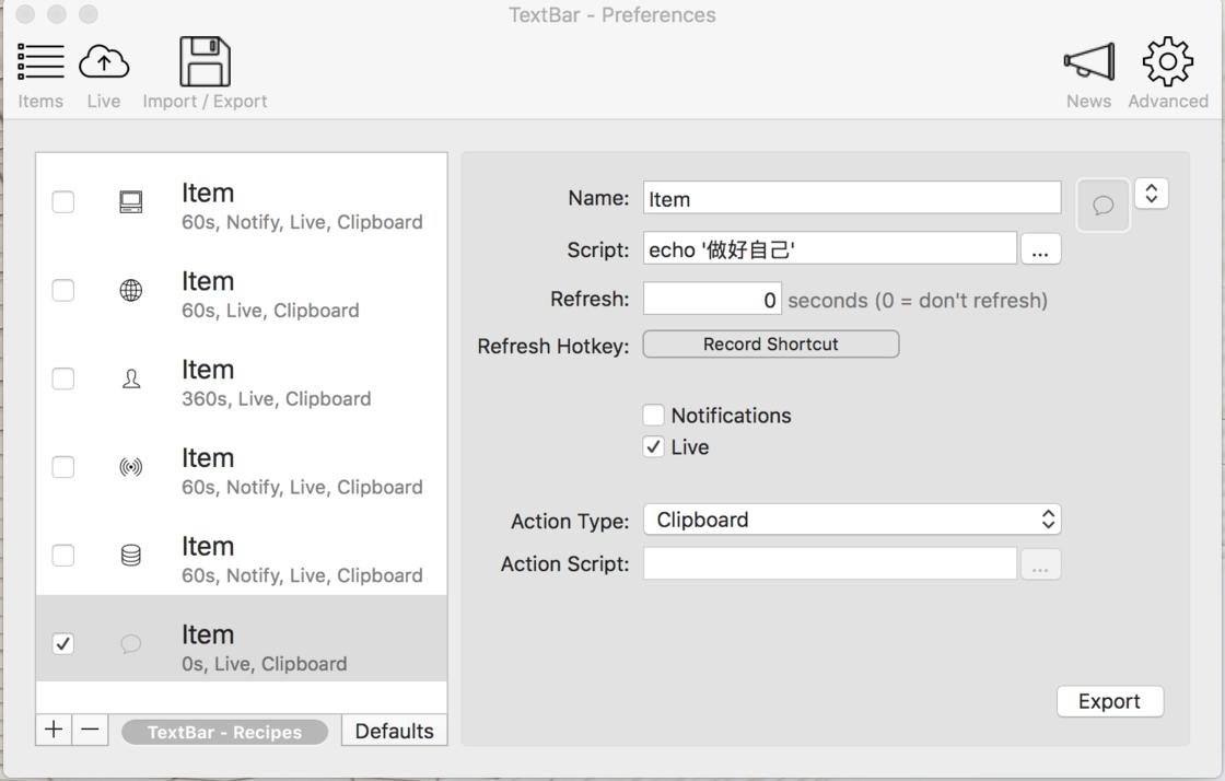 TextBar是一个辅助在Menu Bar上显示一些文字信息的app。官方设定的应用场景举例有:显示我连接的wifi名称,显示剩余硬盘空间,显示IP地址等等。当然,这个应用也可以用于显示我的座右铭啦~使用非常简单,在应用的Preference窗口中可以添加项目,然后输入脚本即可,对于一个简单的座右铭,echo语句便可以满足需求了: