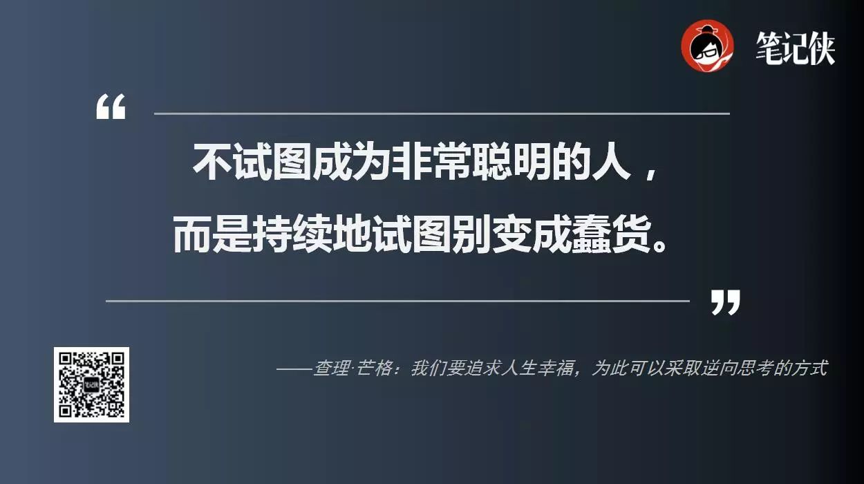 我们要追求人生幸福,为此可以采取逆向思考的方式:如果要明白人生如何才能得到幸福,首先要研究人生如何才能变得痛苦;研究企业如何做强做大,首先要研究企业如何倒掉。生活上的大多数成功来自于你应该知道避免哪些事情(死亡、糟糕的婚姻、艾滋病、吸毒)。