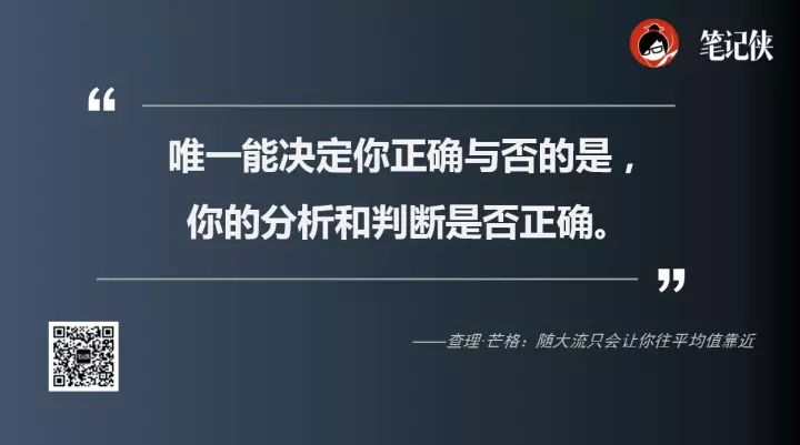 记住,你是对是错,并不取决于别人同意你还是反对你——唯一能决定你正确与否的是——你的分析和判断是否正确。随大流只会让你往平均值靠近(只能获得中等的业绩,即均数回归)。