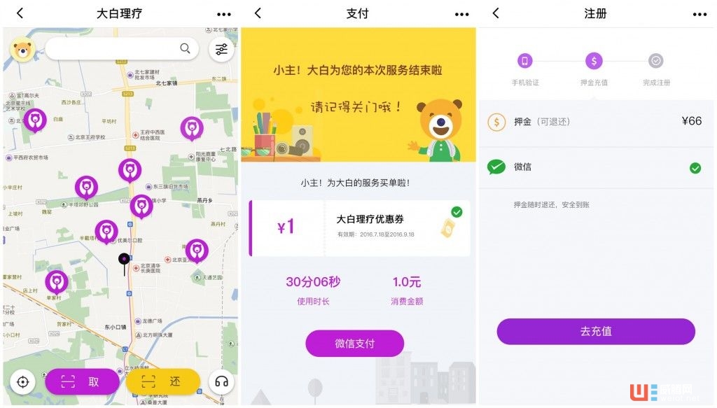 大白理疗的基本服务模式是:用户微信扫码进入大白理疗的小程序界面注册,缴纳66元押金后成为会员,扫码打开智能柜门取出理疗仪,收费为每小时0.5元,使用结束后再次扫码即可开柜归还。今年10月,大白理疗新增加了支付宝小程序应用入口,用户开通信用芝麻分后,满600分即可免押金。
