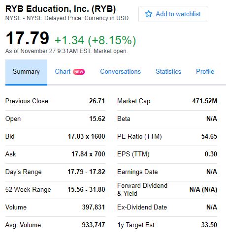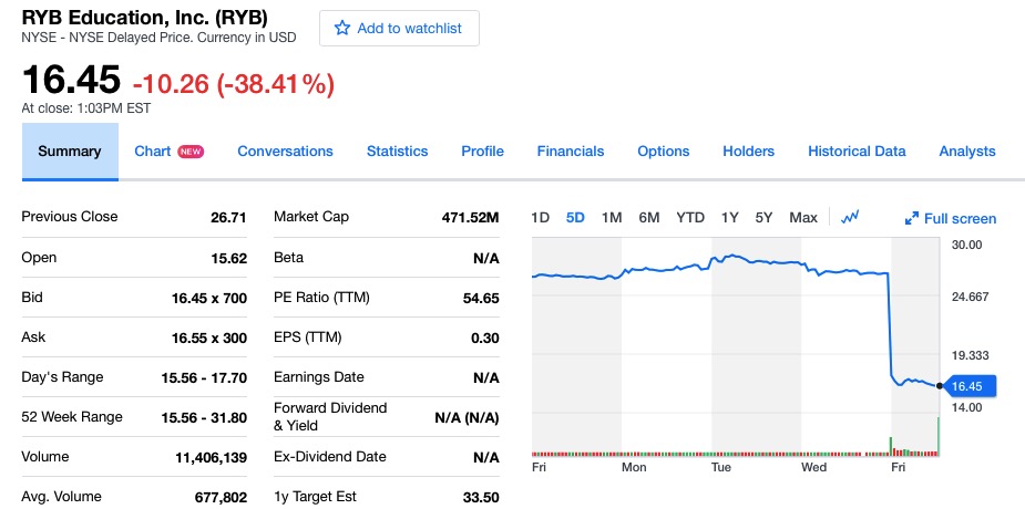 虐童事件引发舆论轩然大波。24日为美国感恩节休市后首个交易日,红黄蓝盘前跌幅一度接近49%,随后红黄蓝教育紧急宣布5000万美元股票回购计划,开盘跌幅小幅收窄至41%,报15.93美元,低于18.5美元的发行价。
