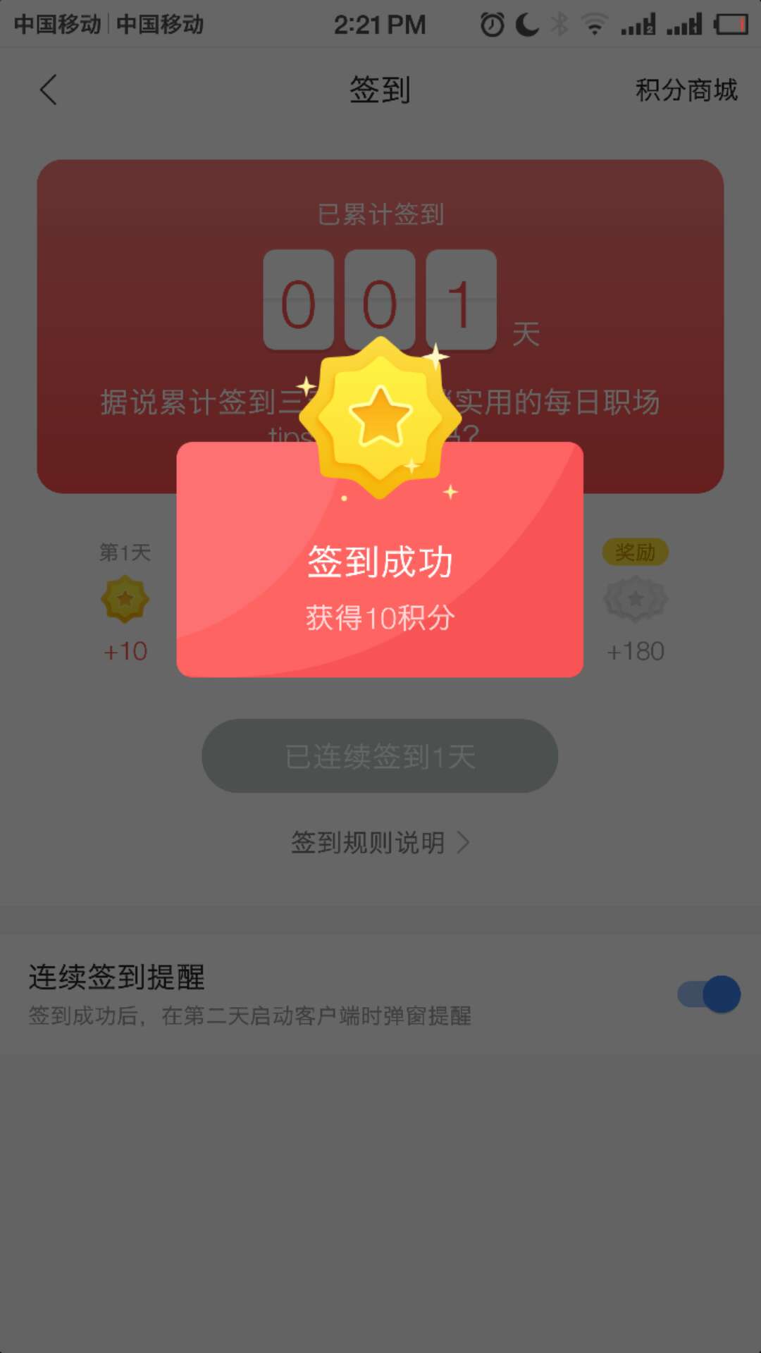 2.点击签到按钮,将积分收入账户。