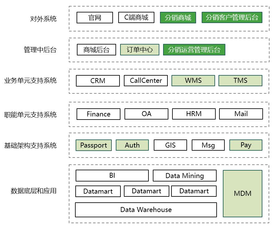 现在,需要考虑分销平台的三个子系统,如何与公司的整体应用架构融合问题。公司经过多年发展,系统架构体系已经非常完备,大量公共组建和模块可以复用,这样就减轻了新平台的实现成本和难度。分销平台只需要聚焦自己业务特殊独立的地方,其他公共组建和模块复用已有系统即可。