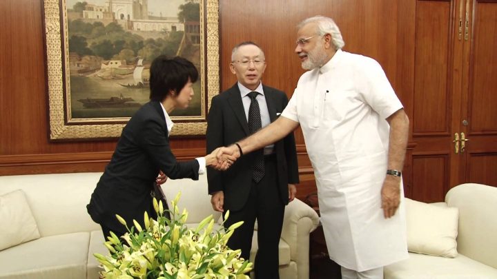 (图片中间为迅销集团 CEO 柳井正,右为印度总理莫迪,图片来自:YouTube)
