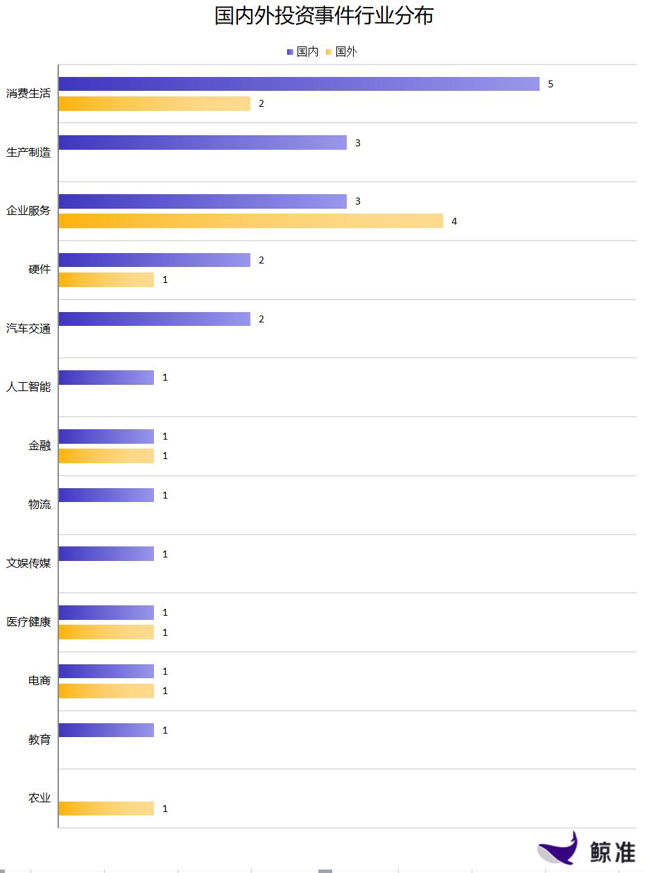 本日国内外共有33起融资事件,分布在13个行业中。国内22个项目获得融资,国外11个项目获得融资。