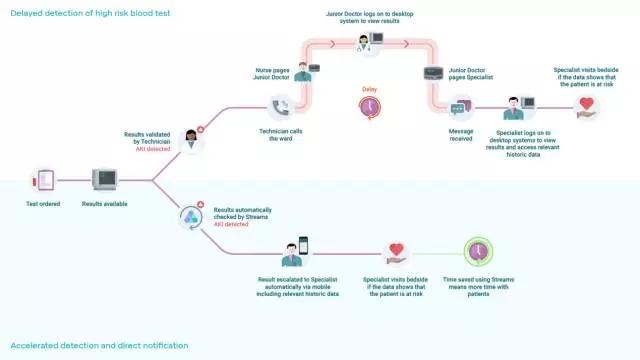 医疗系统的诊治流程化将会极大的改善医疗状况。这一系统构建出一个称为Streams 的app,其目标是及时地为医护人员持续的提供病人相关的信息流,特别是检查数据,以保证病人获得及时、适宜的临床医疗措施。