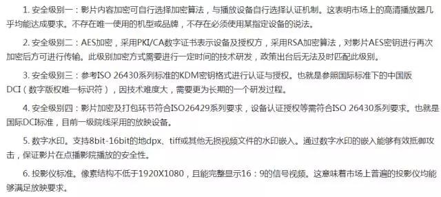 为了解决片方担心的安全问题,广电总局在《通知》中也明确规定了点播影院的放映系统设备等级,其中安全级别达到三或四的,都满足和传统商业影院一样的DCI放映标准。
