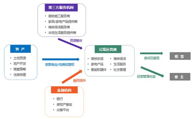 长租公寓产业链可以简单分为上游资产(房源),下游租客,以及中间长租公寓运营商,在公寓运营的过程中,平台基于成本控制出发,一般不会自建装修施工队、家电维修、家政保洁以及其他生活服务团队,因此第三方服务机构为公寓运营商提供必不可少的产品以及服务支持。此外,长租公寓是一个资金和资源双重密集型的行业,金融机构对于企业融资具有非常重要的影响。