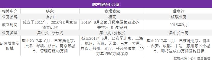 房地产服务中介较早开始布局长租公寓,因其租赁业务中承上启下的作用,以最直接的行业视角与敏捷的姿态抢先布局长租公寓,并通过在房源以及客源中的优势,以较低成本收集房源,迅速规模化。房产服务中介系代表玩家如:链家(自如)、我爱我家(相寓)、世联行(红璞)。