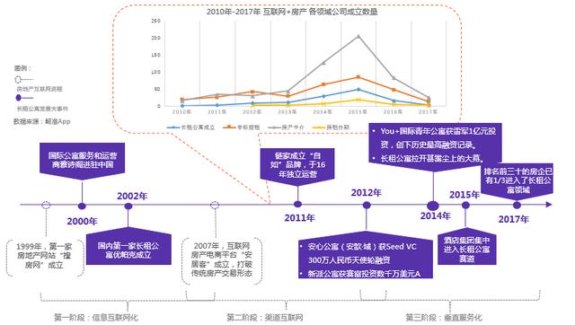 长租公寓的爆发随着房地产互联网化的加深而伴生的。1999年,第一家房地产网站“搜房网”成立,随后2年,300多家房地产网站先后成立;2007年,互联网房产电商平台“安居客”成立,打破传统房产交易形态;2012年开始,受国外领先商业模式影响,各类互联网+房产创业百花齐放,根据鲸准App数据统计,2012-2014年间成立的长租公寓、非标短租、房产中介、房产众筹、房租分期等赛道项目数量达到了400之多。