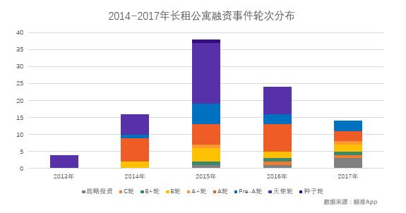 详细来看,至2012年起,长租公寓领域共发生融资事件99起; 2014年,资本开始进入长租公寓,共发生16起融资事件,融资集中在天使与A轮;2015年,长租公寓领域融资有爆发式的增加,总投资近40起,B轮及B+轮项目获得5起融资;2016年,赛道融资趋冷,早期融资减少,而C轮、C+轮与战略融资开始增加,投资进入缓冲期。