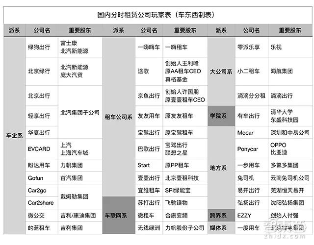 据车东西之前的统计,目前国内共有8大派系共计超过36家分时租赁公司,涉及上汽、北汽、吉利、力帆等整车厂,一嗨租车、途歌等租车公司,以及滴滴、海航等巨头公司,详细可见下表。